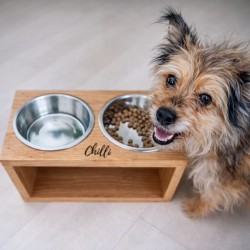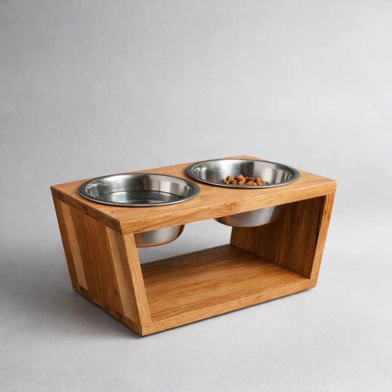 Leseno stojalo za pasje posode iz masivnega hrasta, obdelano z naravnim oljem, primernim za stik z živili.