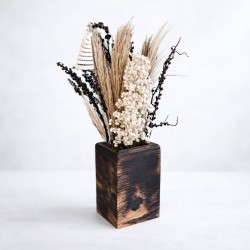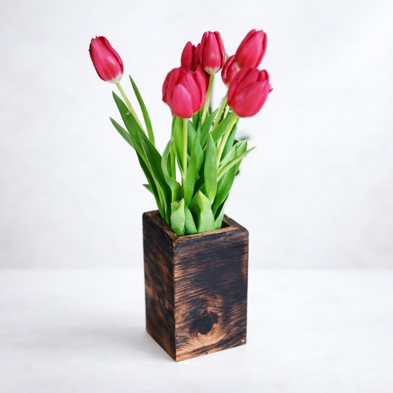 Ročno izdelana lesena vaza iz starega masivnega hrasta, ki je ročno površinsko ožgan za temnejši, umirjen videz. Les ohrani svojo naravno strukturo, vsak kos pa ima nekoliko drugačen odtenek in vzorec.